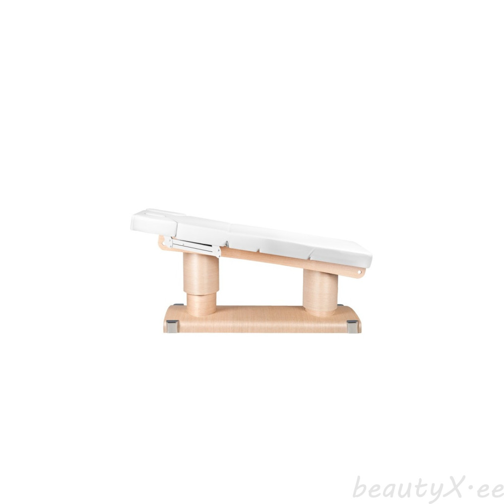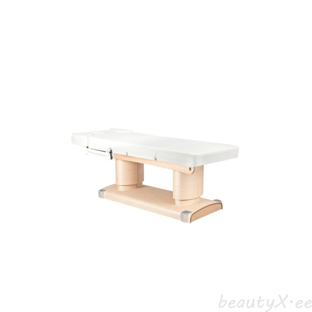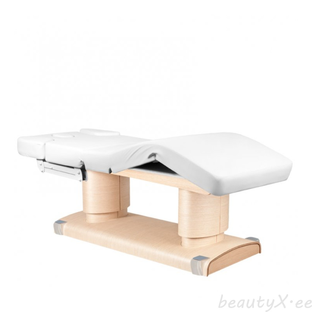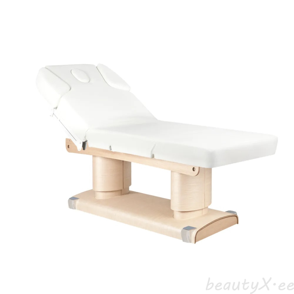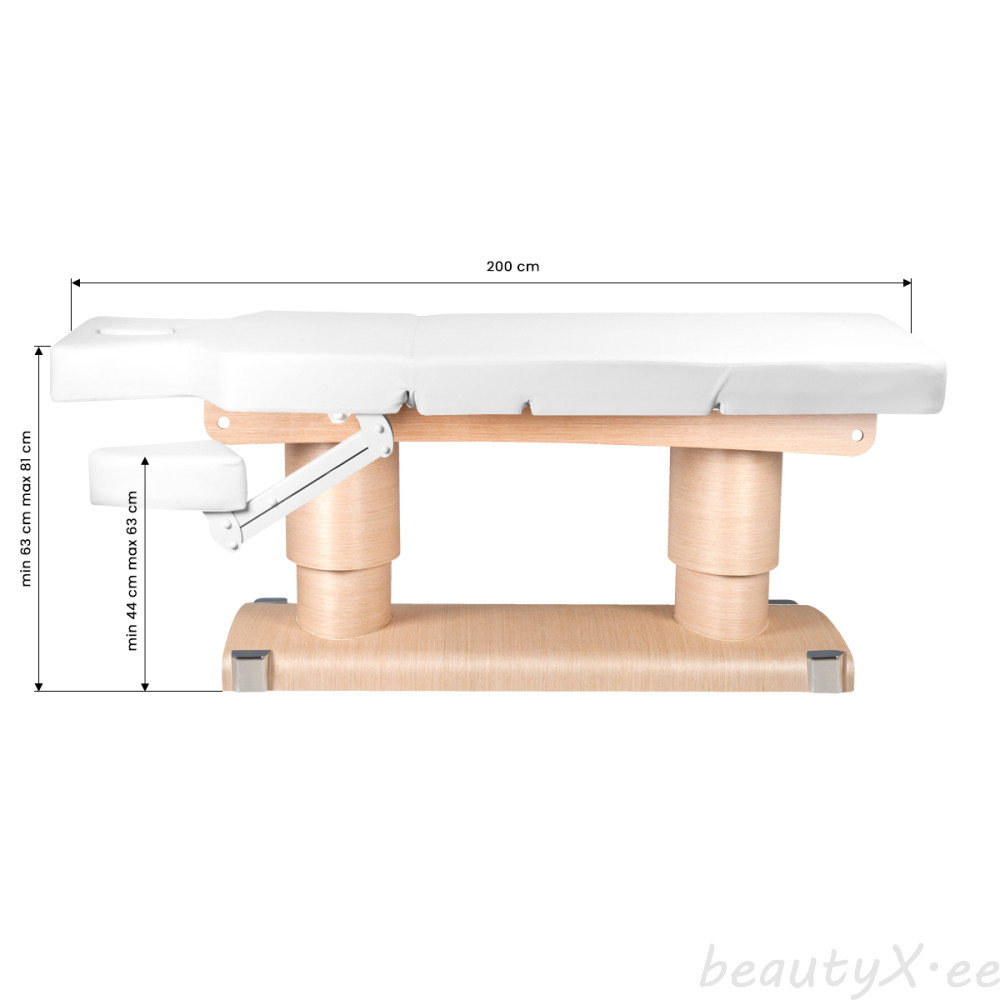 This electric beauty treatment bed features a wide height adjustment range from 64 to 82 cm. The backrest and footrests are also adjustable via remote control. The backrest has a facial opening, and the support legs are independently adjustable. The bed is wide (76 cm) and features a thick, very comfortable heated mattress. It is very stable and upholstered in high-quality eco-leather in a delicate ecru shade.