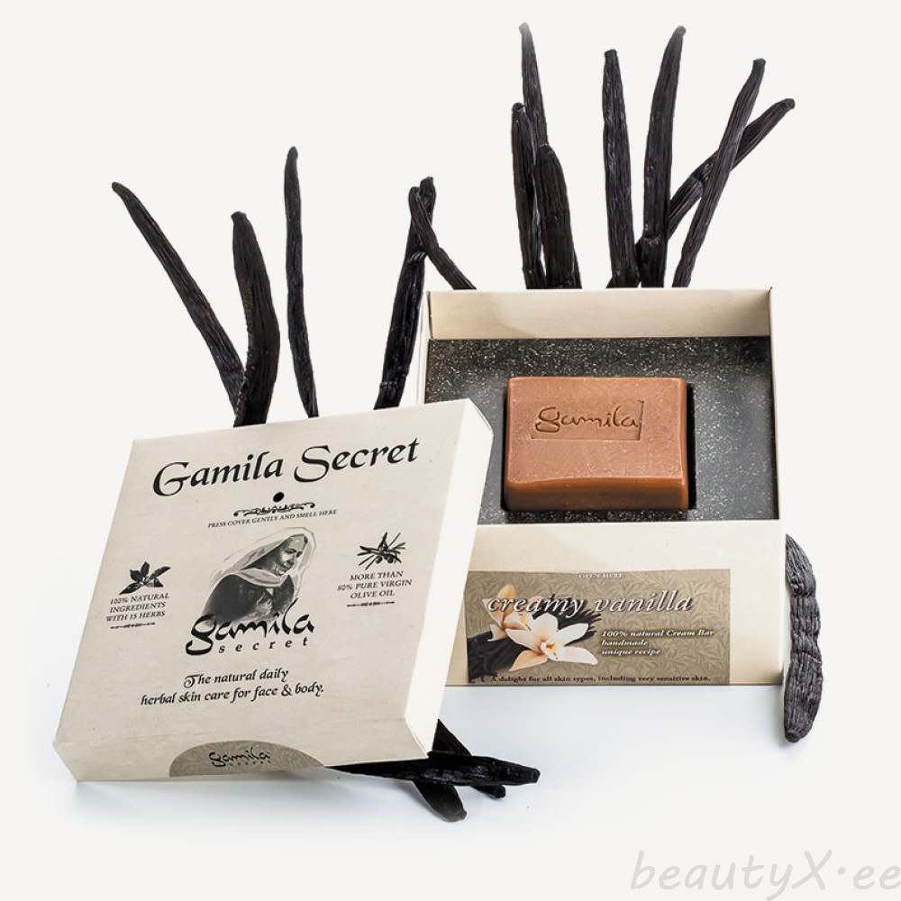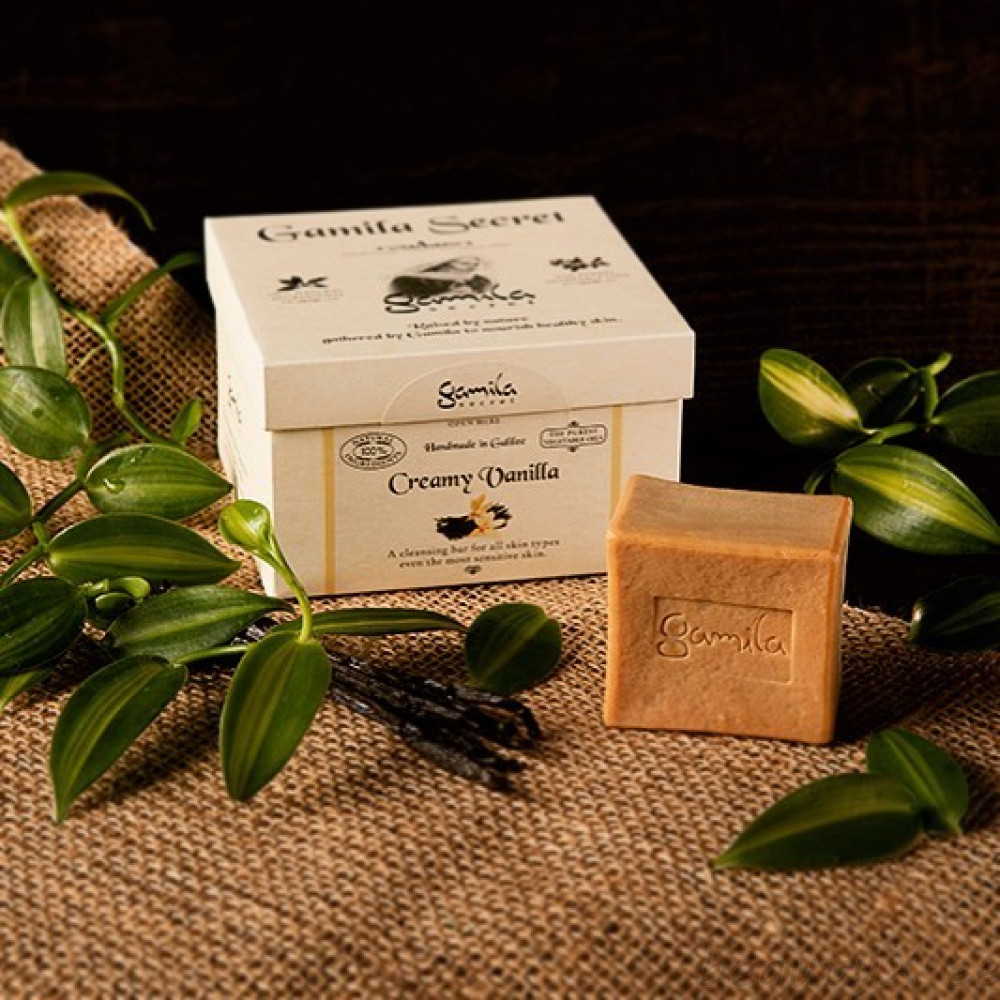 Gamila Secret Creamy Vanilla is a premium line Cleansing Bar that has 100% natural ingredients, six of them are pure plant oils and Gamila secret herbal formula.