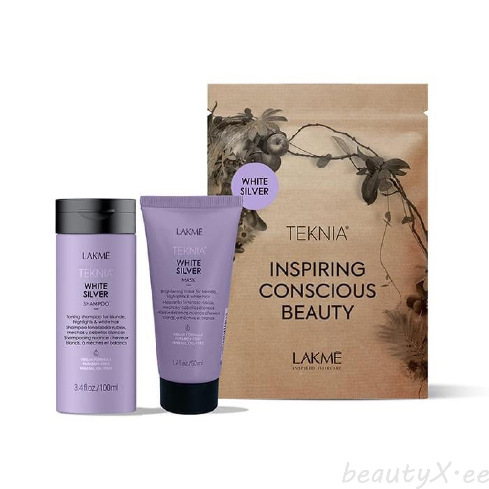 Состав набора: Тонирующий шампунь для нейтрализации желтого оттенка волос - Lakme Teknia White Silver Shampoo, 100ml + Тонирующая маска для нейтрализации желтого оттенка - Lakme Teknia White Silver Mask, 50ml
